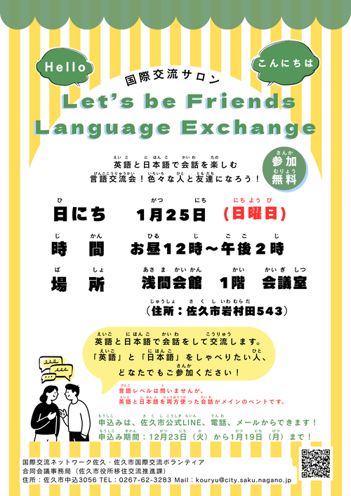 | 第12回 | 1月25日 | 日曜日 | 浅間会館 1階 会議室 | 12:00~14:00 | 「Let's be friends! Language Exchange」 |