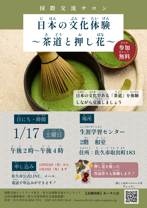 | 第11回 | 1月17日 | 土曜日 | 生涯学習センター 和室 | 14:00~16:00 | 「日本の文化体験 ~茶道と押し花~」 |