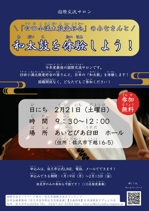 第14回国際交流サロン『~臼田小満太鼓愛好会のみなさんと~ 和太鼓を体験しよう!』