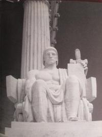 ワシントンDC合衆国最高裁判所「正義の剣像」原作者ジェームズ・R・フレイザー1935年完成 原型像製作中の吾蔵 出典『彫塑家・川村吾蔵の生涯』飯沼信子著・舞字社/佐久市川村吾蔵記念館(この項何れも)