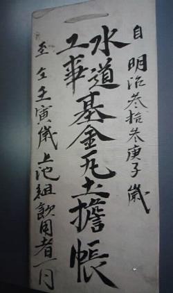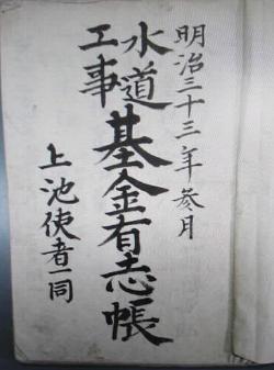 その不足資金を補うため直接就労の記録、それは地場産業の瓦製造業で使う原材料土の採掘と、運搬による就労金を記帳した『明治33年水道工事基金瓦土担い帳』や、直請けによる水田基盤整備事業の益金『明治34年4月水道工事基本金出途ニ付田普請人足帳』を残しています。