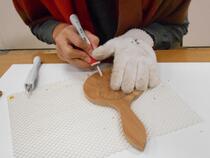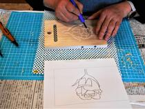 彫りたいものを決め、板面に図案を描き写し、立体的に盛り上がるよう浮き彫りをしました。