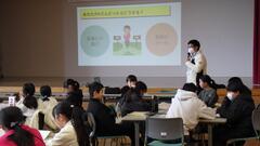学校教育課の水嵜先生に、情報モラルについてのお話を聞きました。日頃のメディアの利用実態について出し合い、様々なトラブルについて考えました。