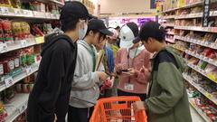 グループごとにランチに必要な食材の買い物をしました。限られた時間の中で、予算に収まるように購入するのは大変でした。