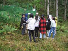 池田先生のお話を聞いた後、望月の実地観察に出かけました。森の中に設置された植生回復柵の内外を観察すると、外側の植生が明らかにダメージを受けていることがわかりました。