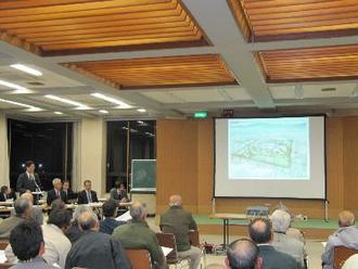 説明会では、佐久総合病院から佐久医療センターの整備計画、臼田の本院基本構想(案)、ドクターヘリについての説明を行い、その後、佐久市都市計画課より佐久医療センターの周辺道路整備計画について説明をしました。