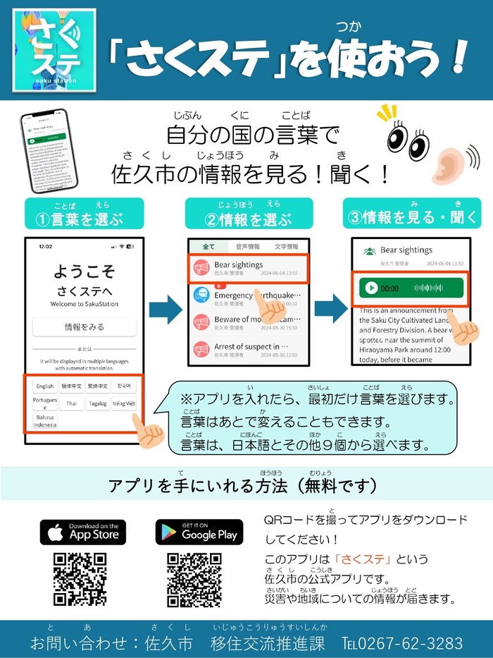 「さくステ」とは、いろいろな国の言葉で佐久市の防災情報を見たり聞いたりできるアプリです。