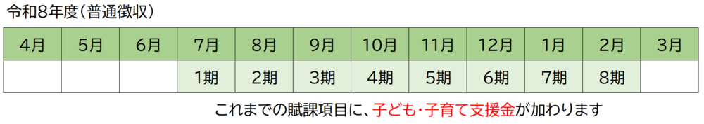 支援金は、令和8年4月分から医療保険料とあわせてご負担いただくことになりますが、実際に徴収が開始する時期は加入する医療保険によって異なります。佐久市国民健康保険においては、7月中旬に送付予定の納税通知書により、納付をお願いすることになります。
