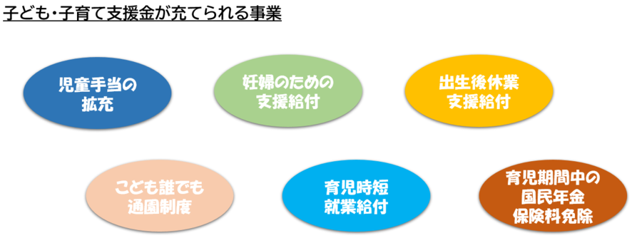 「子ども・子育て支援金制度」は、全世代や企業の皆様から支援金を拠出いただき、それによる子育て世帯に対する給付の拡充を通じて、こどもや子育て世帯を社会全体で応援する仕組みです。皆様からいただいた支援金は、児童手当の拡充、妊婦のための支援給付、育児期間中の国民年金保険料免除など、さまざまな給付の財源となります。