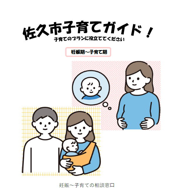 母子健康手帳交付等の手続きの際に、妊娠から子育てにおける支援についてまとめた「佐久市子育てガイド」をお渡ししています。