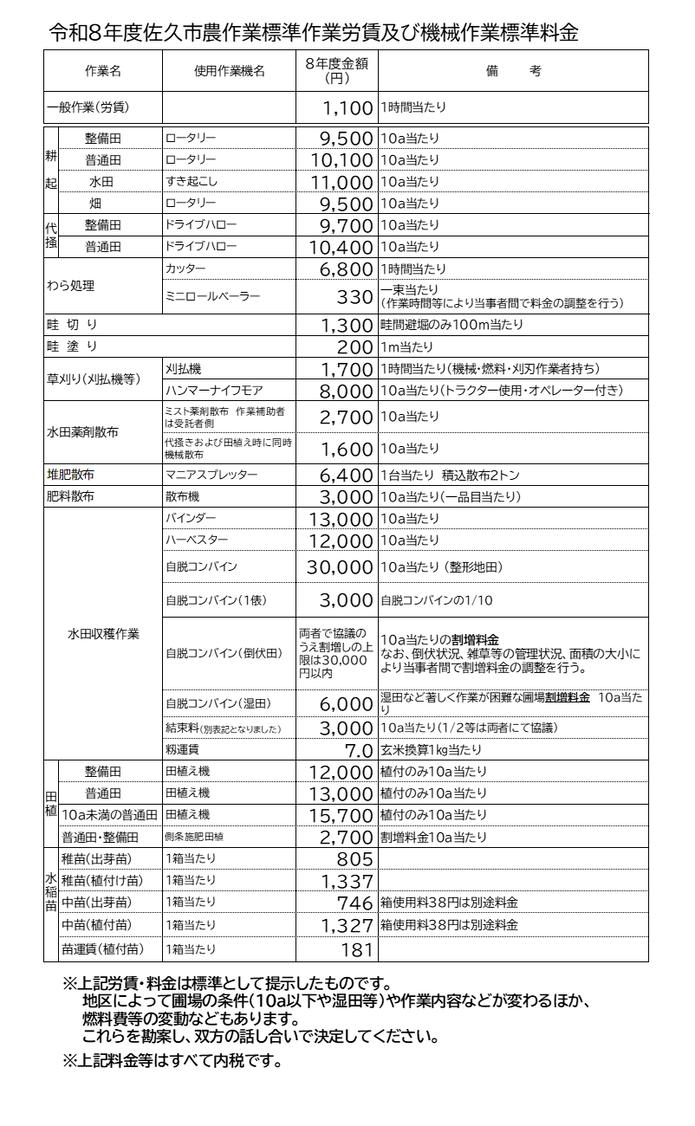 令和8年度佐久市農作業標準作業労賃及び機械作業標準料金