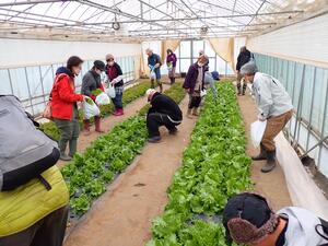 実技では、マルチ張りのやり方、ジャガイモの施肥についてなどの話がありました。また、ハウス内で2月から栽培しているサニーレタスと玉レタスの生育状況の違いを確認しながら、収穫体験を行いました。受講生の皆さんからは講師に質問する姿が多くみられました。
