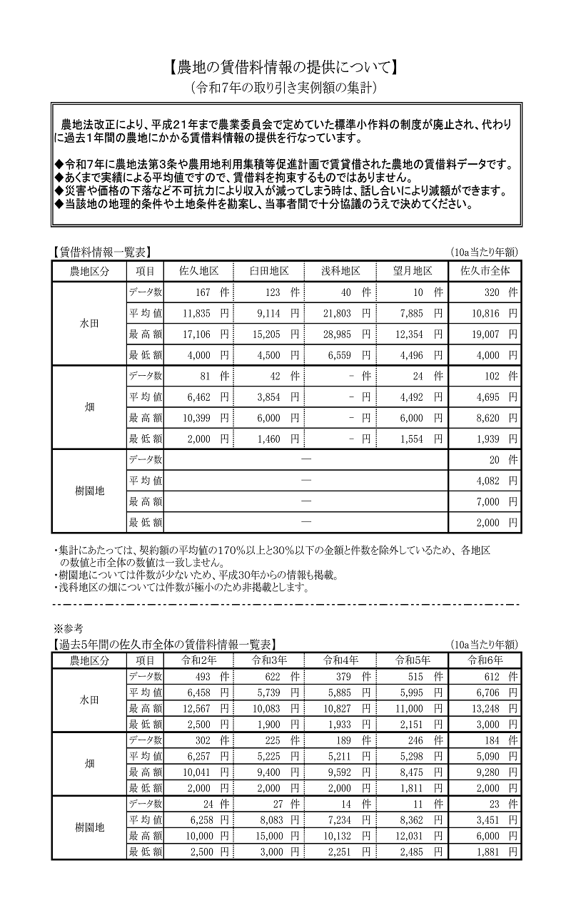 農地の賃借料情報についてお知らせします。