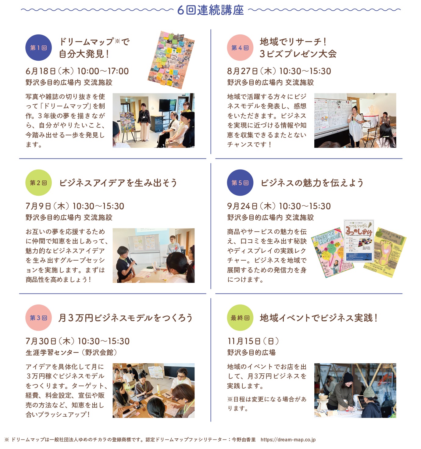 内 容 写真や雑誌の切り抜きを使って「ドリームマップ」を制作。3年後の夢を描きながら、自分がやりたいこと、今踏み出せる一歩を発見します。