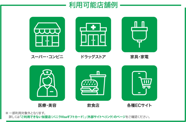 Visaカード利用可能店舗(ネットショップ含む)においても、バニラVisaギフトカードでお支払いいただけない商品・サービスがあります。