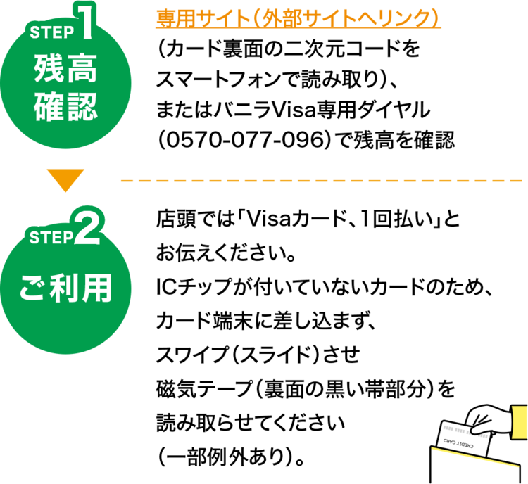 専用サイト(外部サイト)(カード裏面の二次元コードをスマートフォンで読み取り)、またはバニラVisa専用ダイヤル(0570-077-096)で残高をご確認ください。 - 残高以上のお買い物にはご利用いただけない場合があります。不足分を現金やポイントで支払えるか、ご利用前に「利用可能店舗」ページまたは使用するお店にご確認ください。