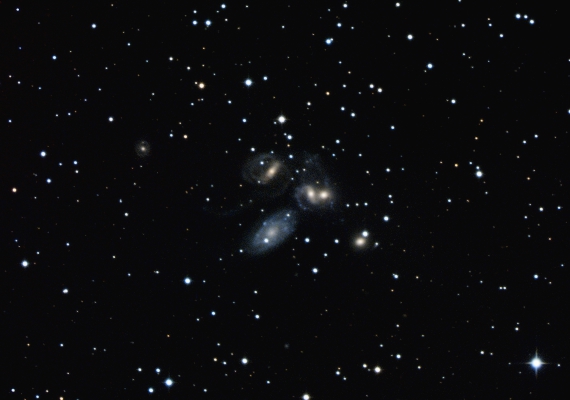ぺガスス座の有名な系外銀河グループ。1877年にフランスの天文学者ステファンが発見したもので、中型以上の望遠鏡で見えてきます。ニックネームのとおり5つの銀河が近くに寄ってお互いに重力を及ぼしあい、渦の形が崩れています。このようにいくつかの銀河が非常に接近しているものは全天にいくつか見つかっていて、「コンパクト銀河群」と呼ばれます。ただしこの銀河群の場合、左下のもの(NGC7320)だけはたまたま同じ方向に見えているだけで実際は他の4つよりずっと手前にあると考えられています。